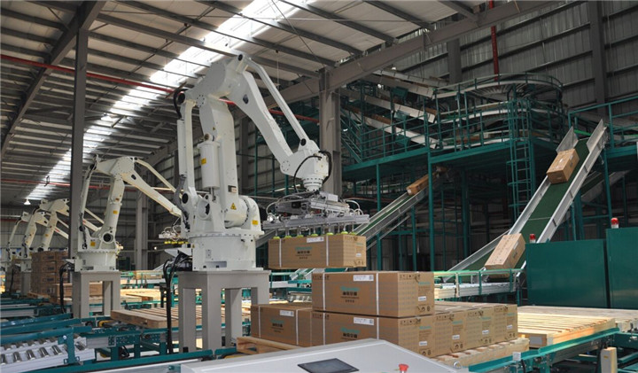 (四)自動(dòng)化下線機(jī):通過(guò)機(jī)器人完成自動(dòng)夾取產(chǎn)品、自動(dòng)堆碼、自動(dòng)取夾板等操作,全過(guò)程無(wú)人化操作,可滿足產(chǎn)品質(zhì)量在150KG內(nèi)的自動(dòng)堆垛,安定效率高。