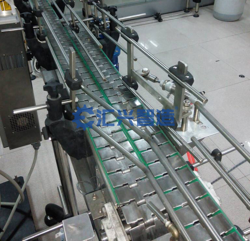 鏈板輸送線以標(biāo)準(zhǔn)鏈板為承載面,由馬達(dá)減速機(jī)為動(dòng)力傳動(dòng);我們可以通過(guò)多列鏈板并行,使鏈板輸送線做的很寬并形成差速,利用多列鏈板的速度差使多列輸送在無(wú)擠壓的情況下變?yōu)閱瘟休斔停瑥亩鴿M足飲料貼標(biāo)、灌裝、清洗等設(shè)備的單列輸送的要求,同樣也可以使單列變成多列并行走緩慢,從而產(chǎn)生儲(chǔ)存量,滿足殺菌機(jī)、儲(chǔ)瓶臺(tái)、冷瓶機(jī)的大量供料的要求,我們可以將兩條鏈板輸送線的頭尾部做成重疊式的混合鏈?zhǔn)沟闷浚ü蓿w處于動(dòng)態(tài)過(guò)度狀態(tài),使輸送線上不滯留物料,可以滿足空瓶以及實(shí)瓶壓力和無(wú)壓力輸送。