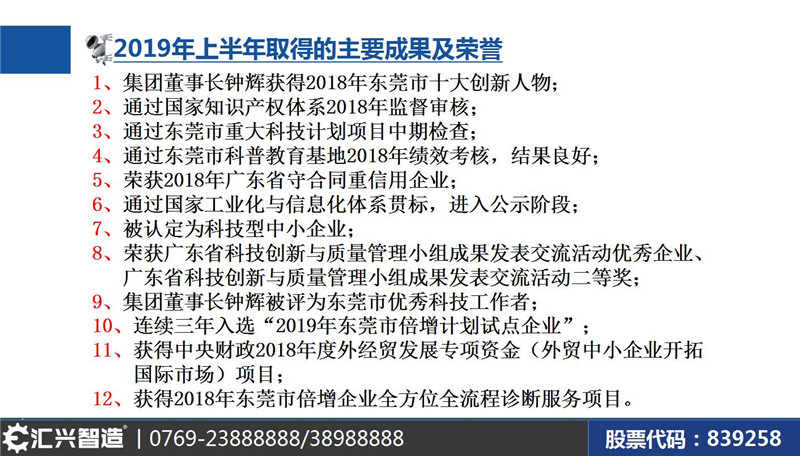 大會(huì)第五項(xiàng)議程知識產(chǎn)權(quán)部經(jīng)理蔣明華“年上半年取得的主要成果匯報(bào)”。實(shí)力見證榮耀,品質(zhì)鑄就輝煌。公司始終牢記“做受尊敬的好人、造受尊敬的產(chǎn)品、辦受尊敬的企業(yè)、建受尊敬的平臺”的企業(yè)使命,砥礪奮進(jìn),載譽(yù)而歸。這些榮譽(yù)既是對匯興智造年上半年成就的肯定,又是對未來發(fā)展的勉勵(lì)!