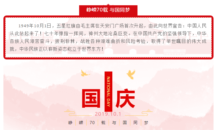 禮贊新中國,奮進新時代!值此中華人民共和國成立70周年的美好時刻,讓我們共同祝愿我們偉大的祖國更加繁榮富強!祝愿我們偉大的人民更加幸福安康