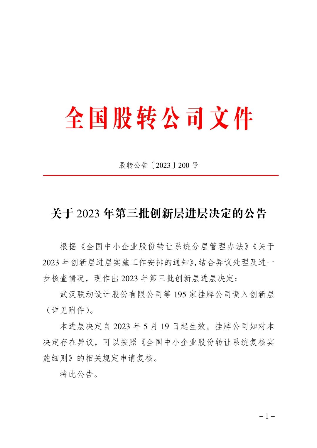 全國中小企業(yè)股份轉(zhuǎn)讓系統(tǒng)有限責任公司于2023年5月17日在其官網(wǎng)發(fā)布的《關于2023年第三批創(chuàng)新層進層決定的公告》(股轉(zhuǎn)公告【2023】 200 號),廣東匯興精工智造股份有限公司(股票代碼:839258)憑借持續(xù)增長的經(jīng)營業(yè)績從眾多基礎層掛牌公司中脫穎而出,2023年5月19日正式進入新三板創(chuàng)新層,邁向更高層次的資本舞臺。