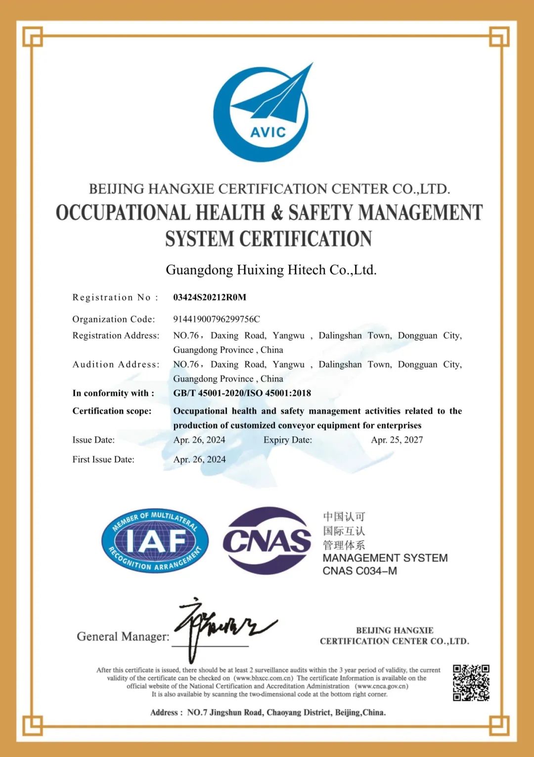 “做受尊敬好人,造受尊敬的產(chǎn)品,辦受尊敬的企業(yè),建受尊敬的平臺”是匯興智造的企業(yè)使命。4月7-9日,廣東匯興精工智造股份有限公司通過北京航協(xié)認證中心審核組進行為期3天的ISO14001環(huán)境管理體系和ISO45001職業(yè)健康安全管理體系認證,經(jīng)過主管機構(gòu)全面、嚴格、細致的審核,公司各項審核項目均已達到ISO14001環(huán)境管理體系和ISO45001職業(yè)健康安全管理體系標準要求,并于2024年4月26日正式獲得ISO14001環(huán)境管理體系和ISO45001職業(yè)健康安全管理體系認證證書。